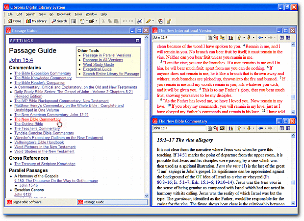 By simply typing "John 15:4" and clicking "Go!" the Bible of your choice opens to the passage and Passage Guide instantly becomes your own personal research assistant, looking for the passage in all of your commentaries, finding scriptural cross-references, maps, illustrations and more, all relating to John 15:4!