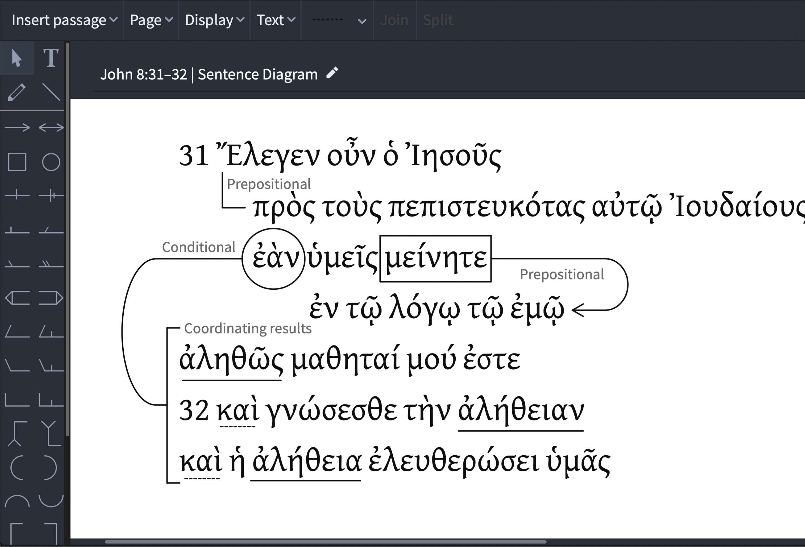 Map syntactic relationships between clauses, phrases, and parts of speech in Greek, Hebrew, or English. Drag and drop to build or modify diagrams. The kind of structural analysis that exposes the exegetical decisions translation obscures.