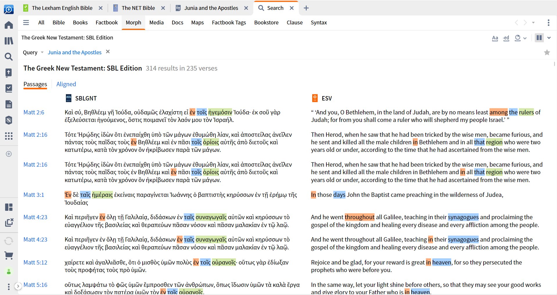 Instantly locate references to Greek, Hebrew, and Aramaic lemmas in the commentaries you own—right from the passage you're studying. Follow a key term into the secondary literature without hunting for it.