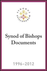 This resource contains documents from the following synods in English and Published by the Vatican: • Special Assembly for America, 1996–1997 • Special Assembly for Asia, 1996–1998 • Special Assembly for Oceania 1997–2001 • II Special Assembly for Europe, 1998–1999 • II Special Assembly for Africa, 2006–2011 • Special Assembly for the Middle East, 2009–2012 • X Ordinary General Assembly, 1998–2001 • XI Ordinary General Assembly of the Synod of Bishops, 2005 • XII Ordinary General Assembly of the Synod of Bishops, 2008