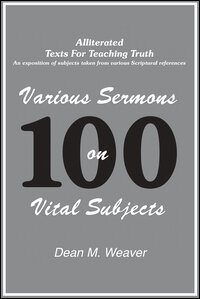 Dean Weaver is a gifted preacher, pastor, and sermon writer who has spent over 46 years pastoring and preaching. Over the decades, Weaver has assembled a treasure trove of unpublished, alliterated sermon outlines. This volume includes 100 alliterated sermons for teaching truth.