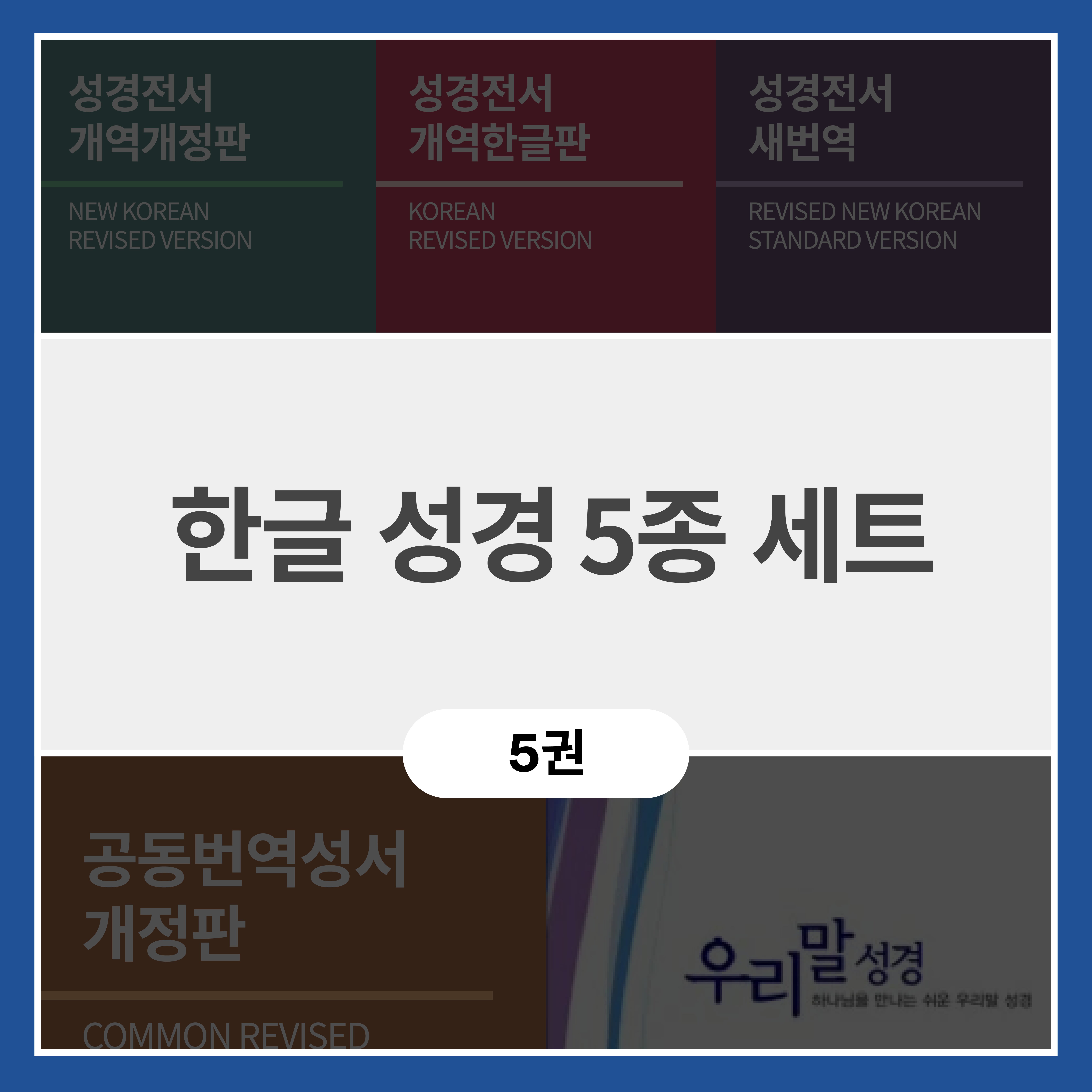한국 교회에서 가장 많이 읽히는 성경전서 개역개정판 (NKRV)을 비롯해, 성경전서 개역한글판 (KRV), 성경전서 새번역 (NKSV), 공동번역성서 개정판 (NCTB), 우리말성경 (DKV)이 포함된 한글 성경 세트.