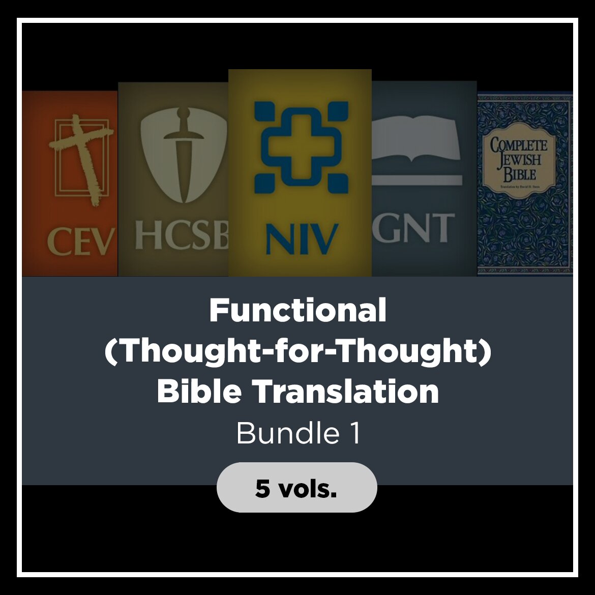 The Functional (Thought-for-Thought) Translation Bible Bundle 1 includes the New International Bible (NIV), Holman Christian Standard Bible (HCSB), Good News Bible (GNB), The Complete Jewish Bible (CJB), and Contemporary English Version (CEV).