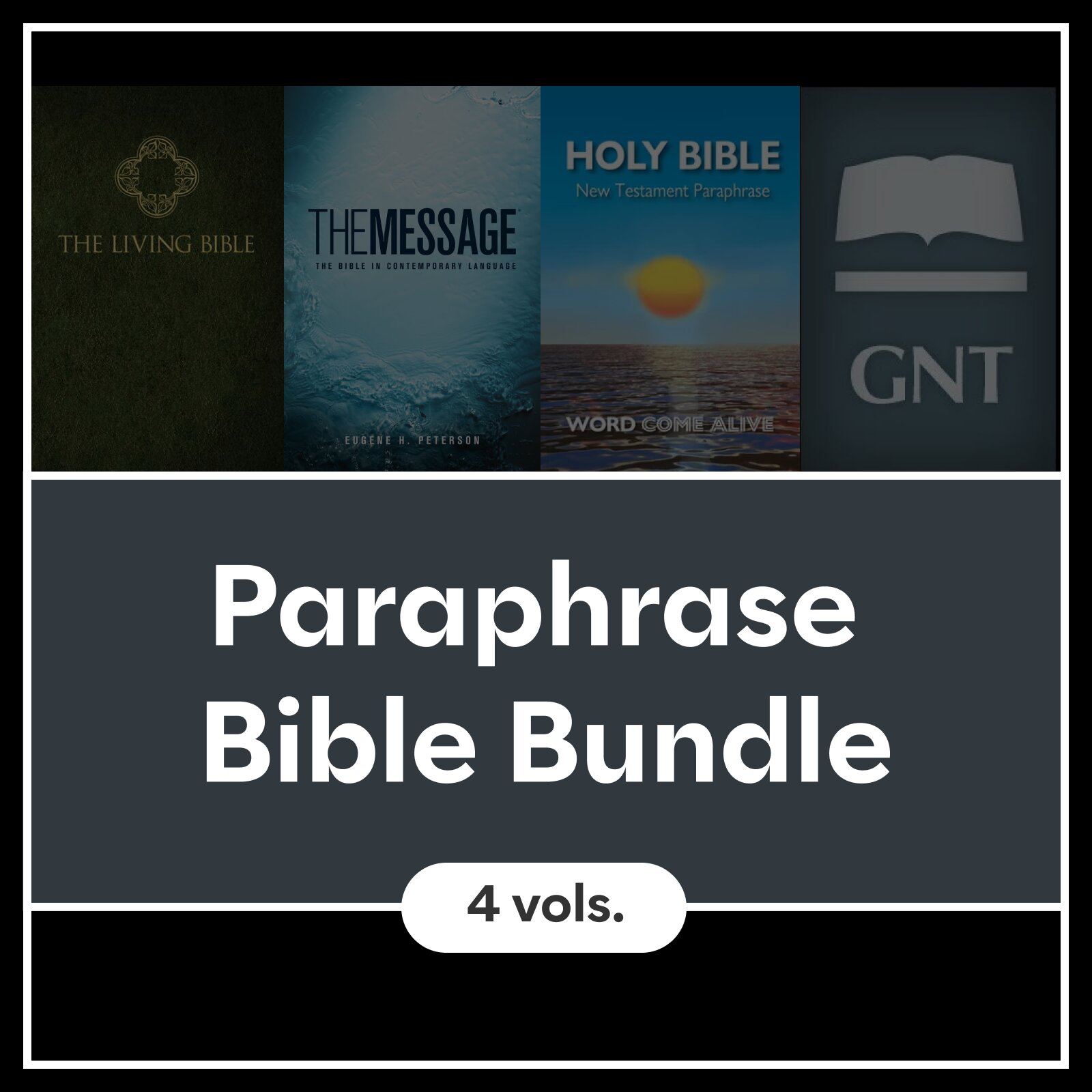 The Paraphrase Bible Bundle includes The Message: Complete OT/NT (MSG), Living Bible (LB), Word Come Alive New Testament Paraphrase, and Good News Translation with Apocrypha (GNT).