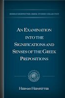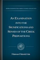 In the following volume, Herman Heinfetter shows that each of the Greek prepositions has its own particular, distinctive signification, or rather sense, and he shows what that sense is. The result of his examination into the significations of the Greek prepositions, is, that not any of them has any definite signification, but that each of them has its own particular definite sense which is expressed by various forms dependent on, and regulated by, the requirements of the context.